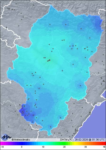 | Actualizado: 00:00 UTC | 9,6°C 83% | 9,6 °C / 84% |  | | 9,1°C / 83% | | 3 km/h NE | | 10 km/h | | 1.020 hPa |