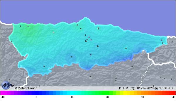 | Actualizado: 07:01 UTC | 6,5°C 95% | 7,1 °C / 95% | | 5,6°C / 82% | | Calma | | 6 km/h | | 1.013 hPa |