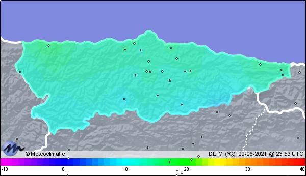 | 22-06-2021 | | | Máx. | Mín. | | | Temperatura | 18,0 | 13,9 | °C | | Humedad | 95 | 80 | % | | Viento | 31 | n/a | km/h | | Presión | 1.026 | 1.016 | hPa |