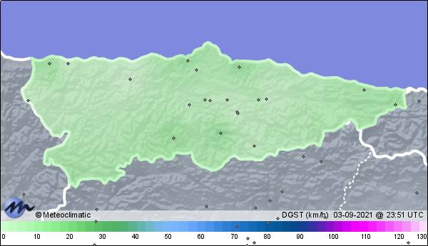 | 03-09-2021 | | | Máx. | Mín. | | | Temperatura | 22,1 | 15,7 | °C | | Humedad | 98 | 77 | % | | Viento | 24 | n/a | km/h | | Presión | 1.019 | 1.016 | hPa | | Precipitación | 0,0 | mm |