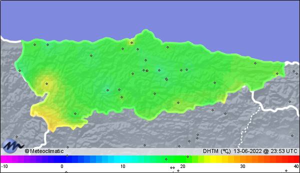 | 13-06-2022 | | | Máx. | Mín. | | | Temperatura | 21,3 | 17,0 | °C | | Humedad | 95 | 81 | % | | Viento | 9 | n/a | km/h | | Presión | 1.026 | 1.019 | hPa |