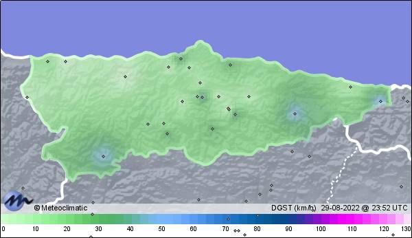 | 29-08-2022 | | | Máx. | Mín. | | | Temperatura | 28,7 | 17,2 | °C | | Humedad | 94 | 51 | % | | Viento | 48 | n/a | km/h | | Presión | 1.016 | 1.009 | hPa | | Precipitación | 0,2 | mm |