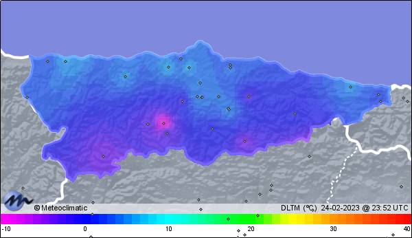 | 24-02-2023 | | | Máx. | Mín. | | | Temperatura | 4,6 | -4,2 | °C | | Humedad | 99 | 45 | % | | Viento | 22 | n/a | km/h | | Presión | 1.013 | 1.010 | hPa |