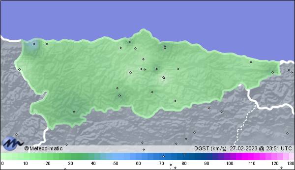 | 27-02-2023 | | | Máx. | Mín. | | | Temperatura | 8,4 | 3,9 | °C | | Humedad | 79 | 48 | % | | Viento | 45 | n/a | km/h | | Precipitación | 0,0 | mm |