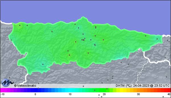 | 24-04-2023 | | | Máx. | Mín. | | | Temperatura | 21,0 | 9,5 | °C | | Humedad | 98 | 53 | % | | Viento | 25 | n/a | km/h | | Presión | 1.019 | 1.015 | hPa |