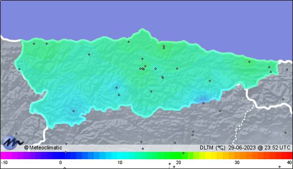 | 29-06-2023 | | | Máx. | Mín. | | | Temperatura | 20,7 | 14,3 | °C | | Humedad | 96 | 79 | % | | Viento | 37 | n/a | km/h | | Presión | 1.025 | 1.019 | hPa | | Precipitación | 5,0 | mm |