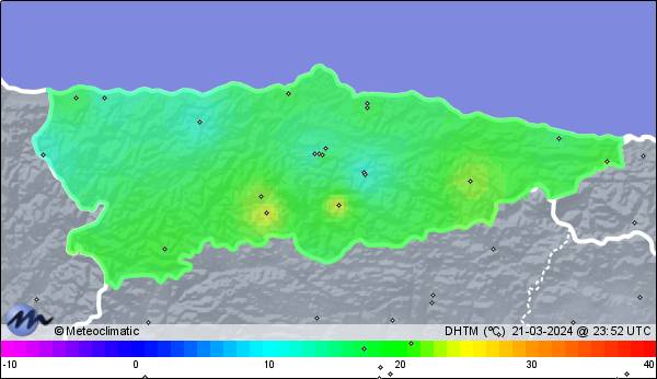 | 21-03-2024 | | | Máx. | Mín. | | | Temperatura | 17,3 | 8,9 | °C | | Humedad | 97 | 77 | % | | Viento | 17 | n/a | km/h | | Presión | 1.029 | 1.024 | hPa |