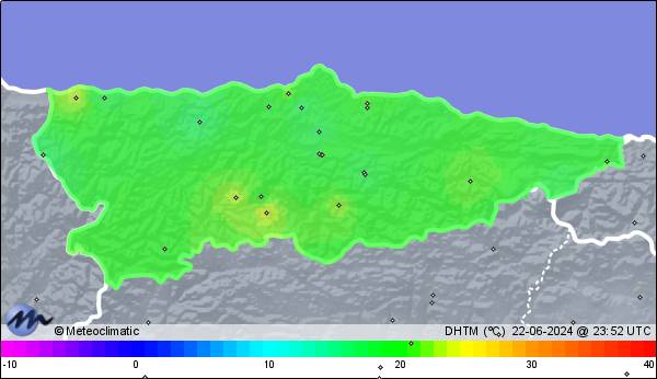 | 22-06-2024 | | | Máx. | Mín. | | | Temperatura | 20,6 | 13,5 | °C | | Humedad | 95 | 75 | % | | Viento | 18 | n/a | km/h | | Presión | 1.016 | 1.014 | hPa |