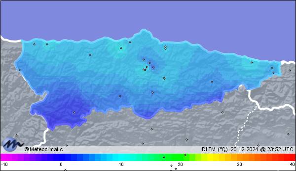 | 20-12-2024 | | | Máx. | Mín. | | | Temperatura | 9,7 | 3,7 | °C | | Humedad | 99 | 69 | % | | Viento | 11 | n/a | km/h | | Presión | 1.038 | 1.034 | hPa |