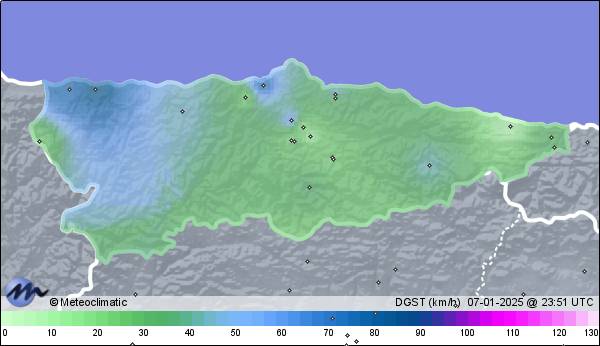 | 07-01-2025 | | | Máx. | Mín. | | | Temperatura | 16,7 | 3,7 | °C | | Humedad | 95 | 50 | % | | Viento | 42 | n/a | km/h | | Presión | 1.013 | 1.006 | hPa | | Precipitación | 0,0 | mm |