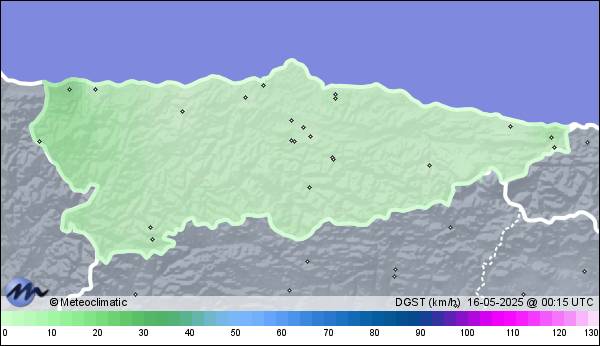 | 15-05-2025 | | | Máx. | Mín. | | | Temperatura | 16,9 | 12,2 | °C | | Humedad | 95 | 78 | % | | Viento | 22 | n/a | km/h | | Presión | 1.024 | 1.021 | hPa | | Precipitación | 0,2 | mm |