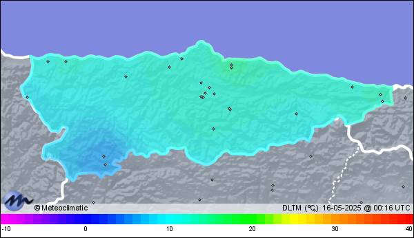 | 15-05-2025 | | | Máx. | Mín. | | | Temperatura | 16,8 | 10,2 | °C | | Humedad | 97 | 73 | % | | Viento | 16 | n/a | km/h | | Presión | 1.025 | 1.022 | hPa | | Precipitación | 3,0 | mm |