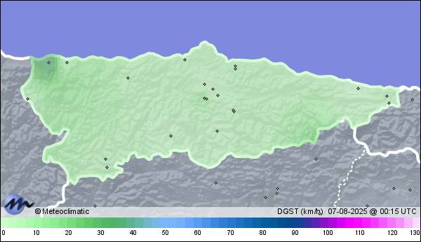 | 06-08-2025 | | | Máx. | Mín. | | | Temperatura | 25,5 | 17,9 | °C | | Humedad | 97 | 72 | % | | Viento | 35 | n/a | km/h | | Presión | 1.023 | 1.016 | hPa | | Precipitación | 0,0 | mm |