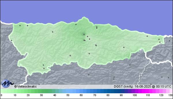 | 15-08-2025 | | | Máx. | Mín. | | | Temperatura | 38,3 | 19,7 | °C | | Humedad | 97 | 33 | % | | Viento | 30 | n/a | km/h | | Precipitación | 0,0 | mm |