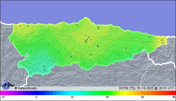 | Act. | Máx.  | Mín. | Act. | Máx. | Mín. | Act. | Máx. | Mín. | Act. | Máx. | Hoy | Año |  |  | Colombres | 115 | 20,2 | 24,7 | 17,8 | 69 | 69 | 47 | 1.007 | 1.010 | 1.007 | 2 SSW | 62 | - | 743,0 |  |  |  | Meres - Siero | 183 | 22,4 | 23,7 | 16,9 | 56 | 69 | 52 | 1.008 | 1.010 | 1.008 | - | 30 | - | 643,1 |  |  |  | La Fresneda | 174 | 22,5 | 23,6 | 15,5 | 54 | 76 | 50 | 1.006 | 1.008 | 1.005 | - | 22 | - | 665,6 |  |  |  | Posada de Llanera | 174 | 23,6 | 23,6 | 16,4 | 59 | 79 | 59 | 1.006 | 1.008 | 1.005 | 1 WNW | 44 | - | 565,2 |  |  |  | Buelles-Peñamellera Baja | 70 | 22,8 | 23,3 | 17,6 | 55 | 68 | 49 | 1.004 | 1.007 | 1.004 | 9 WSW | 39 | - | 613,8 |  |  |  | Oviedo-Rosal | 245 | 22,7 | 23,2 | 16,8 | 57 | 70 | 56 | 1.004 | 1.006 | 1.004 | 16 NE | 52 | - | 502,3 |  |  |  | Oviedo-Fozaneldi | 198 | 22,1 | 23,1 | 17,6 | 51 | 60 | 47 | 1.006 | 1.008 | 1.006 | 6 ESE | 53 | - | 34,6 |  |  |  | Rapalcuarto - Tapia | 35 | 22,2 | 23,1 | 18,2 | 67 | 71 | 61 | 1.005 | 1.006 | 1.003 | 13 SSW | 66 | - | 689,2 |  |  |  | Muñas de Arriba (Valdés) | 216 | 22,7 | 22,7 | 15,4 | 43 | 61 | 43 | 1.003 | 1.004 | 1.001 | 3 SE | 33 | - | 835,2 |  |  |  | A Caridá | 70 | 22,3 | 22,6 | 19,1 | 64 | 71 | 63 | 1.004 | 1.006 | 1.003 | 22 SSE | 55 | - | 674,4 |  |  |  | Quintes | 116 | 22,1 | 22,4 | 18,6 | 59 | 62 | 51 | 1.005 | 1.007 | 1.005 | - | 37 | - | 662,5 |  |  |  | El Entrego | 245 | 22,2 | 22,3 | 17,8 | 54 | 66 | 53 | 1.006 | 1.008 | 1.006 | 1 ESE | 41 | - | 577,0 |  |  |  | Prado de la Vega (Oviedo) | 188 | 22,3 | 22,3 | 16,7 | 57 | 70 | 57 | 1.005 | 1.007 | 1.004 | x | x | - | - |  |  |  | Caborana - Aller | 309 | 21,9 | 21,9 | 17,7 | 49 | 63 | 47 | 1.007 | 1.010 | 1.007 | 5 NNW | 31 | - | 541,8 |  |  |  | Berrueñu (Teberga) | 610 | 20,4 | 21,5 | 14,0 | 53 | 78 | 49 | 1.007 | 1.009 | 1.007 | 2 NW | 42 | x | x |  |  |  | Santa Maria del Mar | 60 | 21,5 | 21,5 | 16,3 | 71 | 77 | 64 | 1.005 | 1.007 | 1.004 | - | 18 | - | 697,1 |  |  |  | Gijón (La Arena) | 25 | 20,7 | 21,2 | 16,5 | 71 | 78 | 61 | 1.004 | 1.006 | 1.003 | 1 NW | 13 | - | 603,3 |  |  |  | Oviedo-Otero | 232 | 21,1 | 21,1 | 17,0 | 56 | 65 | 56 | 1.006 | 1.009 | 1.006 | x | x | - | - |  |  |  | El Entrego-El Colláu | 410 | 20,7 | 20,9 | 16,8 | 59 | 70 | 57 | 1.005 | 1.008 | 1.005 | 3 S | 44 | - | 716,2 |  |  |  | Gijón (Somió) | 30 | 20,6 | 20,9 | 15,4 | 69 | 87 | 60 | 1.003 | 1.006 | 1.003 | 2 NW | 23 | - | 564,4 |  |  |  | Llanes | 17 | 19,4 | 20,7 | 13,1 | 77 | 94 | 51 | 996 | 998 | 996 | - | 13 | x | x |  |  |  | Taramundi - Mazonovo | 210 | 20,2 | 20,4 | 14,2 | 69 | 90 | 68 | 1.005 | 1.007 | 1.005 | 6 WNW | 23 | 1,0 | 1.018,4 |  |  |  | Pen | 380 | 20,2 | 20,2 | 16,4 | 58 | 71 | 58 | 1.003 | 1.005 | 1.002 | 10 E | 42 | - | 714,7 |  |  |  | Gillón, Cangas del Narcea | 1050 | 13,4 | 13,9 | 10,7 | 79 | 86 | 64 | 1.008 | 1.010 | 1.007 | 26 S | 68 | x | x |  |  |  | Oviedo-Villafria | 228 | 13,1 | 13,1 | 13,1 | 91 | 91 | 91 | 1.009 | 1.009 | 1.009 | x | x | - | 332,3 |  |  |  | Monasterio de Hermo | 1012 | 12,7 | 13,0 | 9,9 | 80 | 86 | 76 | 1.007 | 1.009 | 1.006 | 11 NNW | 61 | 16,2 | 363,2 |  |