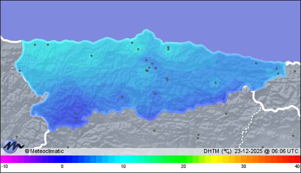 | Actualizado: 03:43 UTC | 3,9°C 92% | 4,1 °C / 92% | | 2,5°C / 89% | | Calma | | 2 km/h | | 1.010 hPa |