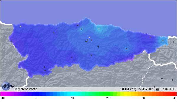 | 26-12-2025 | | | Máx. | Mín. | | | Temperatura | 12,5 | -0,9 | °C | | Humedad | 97 | 47 | % | | Viento | 2 | n/a | km/h | | Precipitación | 0,0 | mm |