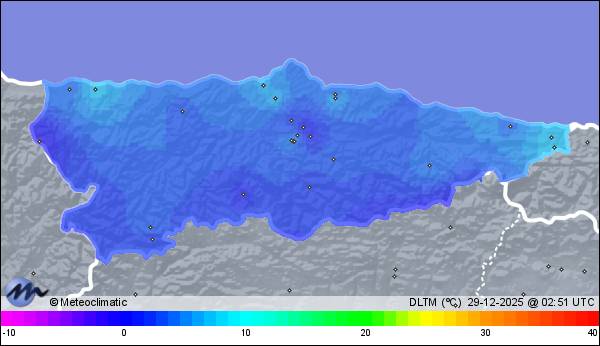 | Actualizado: 00:35 UTC | 3,5°C 93% | 4,3 °C / 93% | | 3,4°C / 91% | | Calma | | 8 km/h | | 1.021 hPa |
