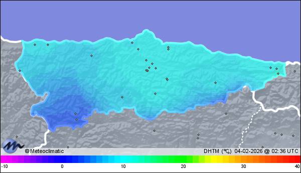 | Actualizado: 00:35 UTC | 9,9°C 71% | 9,9 °C / 83% | | 7,8°C / 70% | | 3 km/h E | | 23 km/h | | 985 hPa | | 0,2 mm |