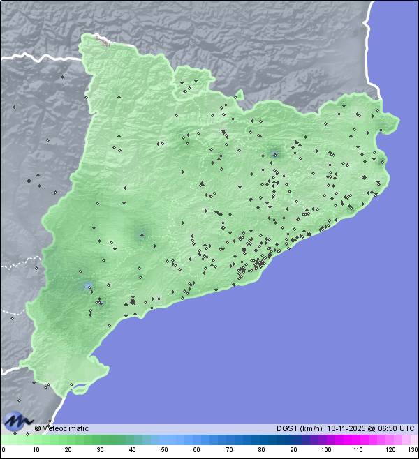 | Puigllançada- Coll de Pal | 2092 | 7,2 | 7,4 | 6,6 | 42 | 49 | 39 | 1.017 | 1.019 | 1.017 | 27 SW | 43 | - | - | |