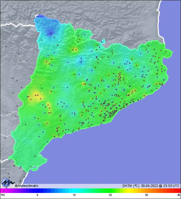 | 30-04-2022 | | | Máx. | Mín. | | | Temperatura | 22,6 | 9,7 | °C | | Humedad | 88 | 47 | % | | Viento | 40 | n/a | km/h | | Presión | 1.023 | 1.017 | hPa | | Precipitación | 0,0 | mm |