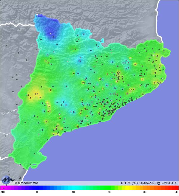 | 06-05-2022 | | | Máx. | Mín. | | | Temperatura | 21,5 | 8,9 | °C | | Humedad | 72 | 27 | % | | Viento | 40 | n/a | km/h | | Presión | 1.020 | 1.015 | hPa | | Precipitación | 0,0 | mm |