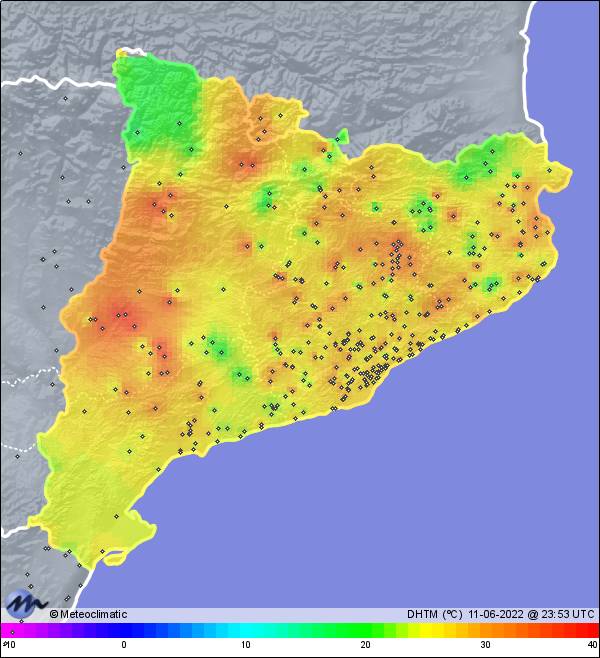 | 11-06-2022 | | | Máx. | Mín. | | | Temperatura | 35,3 | 17,4 | °C | | Humedad | 48 | 19 | % | | Viento | 37 | n/a | km/h | | Presión | 1.023 | 1.019 | hPa | | Precipitación | 0,0 | mm |
