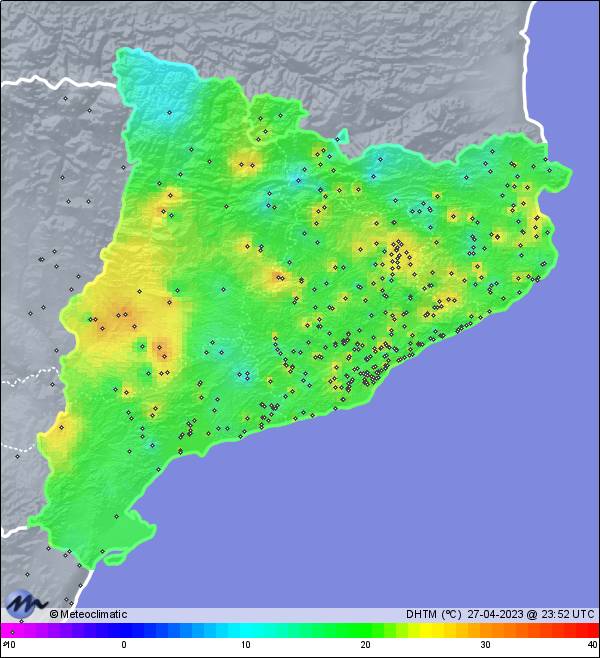 | 27-04-2023 | | | Máx. | Mín. | | | Temperatura | 22,5 | 10,9 | °C | | Humedad | 92 | 58 | % | | Viento | 39 | n/a | km/h | | Presión | 1.017 | 1.014 | hPa | | Precipitación | 0,0 | mm |