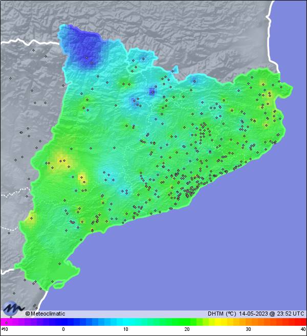 | 14-05-2023 | | | Máx. | Mín. | | | Temperatura | 21,9 | 10,8 | °C | | Humedad | 90 | 39 | % | | Viento | 35 | n/a | km/h | | Presión | 1.018 | 1.015 | hPa | | Precipitación | 0,0 | mm |