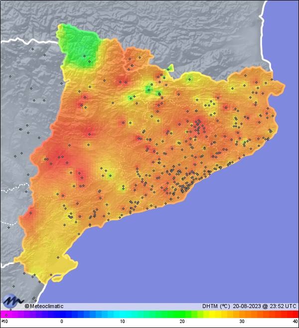 | 20-08-2023 | | | Máx. | Mín. | | | Temperatura | 35,0 | 15,6 | °C | | Humedad | 95 | 38 | % | | Viento | 32 | n/a | km/h | | Presión | 1.018 | 1.016 | hPa | | Precipitación | 0,0 | mm |