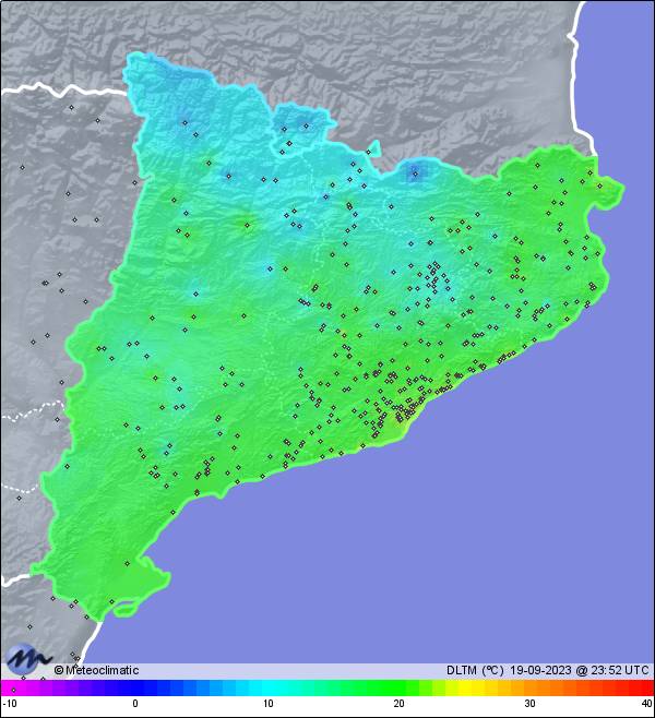 | 19-09-2023 | | | Máx. | Mín. | | | Temperatura | 21,9 | 16,1 | °C | | Humedad | 79 | 56 | % | | Viento | 40 | n/a | km/h | | Presión | 1.018 | 1.014 | hPa | | Precipitación | 9,6 | mm |