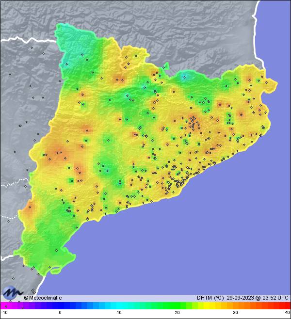 | 29-09-2023 | | | Máx. | Mín. | | | Temperatura | 29,0 | 12,8 | °C | | Humedad | 97 | 39 | % | | Viento | 26 | n/a | km/h | | Presión | 1.025 | 1.021 | hPa | | Precipitación | 0,0 | mm |