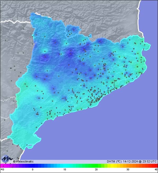 | 14-12-2024 | | | Máx. | Mín. | | | Temperatura | 12,9 | 4,4 | °C | | Humedad | 89 | 61 | % | | Viento | 4 | n/a | km/h | | Presión | 1.030 | 1.026 | hPa | | Precipitación | 0,2 | mm |