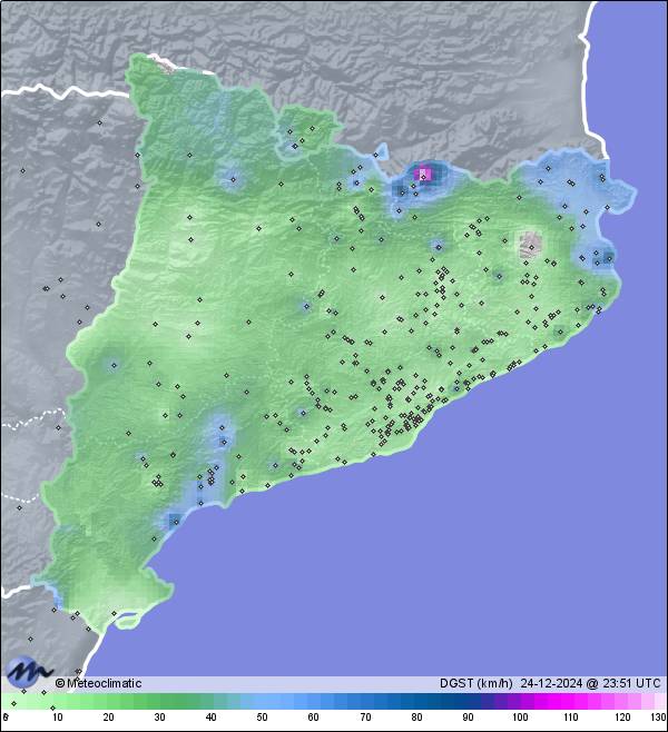 | 24-12-2024 | | | Máx. | Mín. | | | Temperatura | 16,7 | 9,6 | °C | | Humedad | 69 | 57 | % | | Viento | 113 | n/a | km/h | | Presión | 1.023 | 1.020 | hPa | | Precipitación | 0,0 | mm |