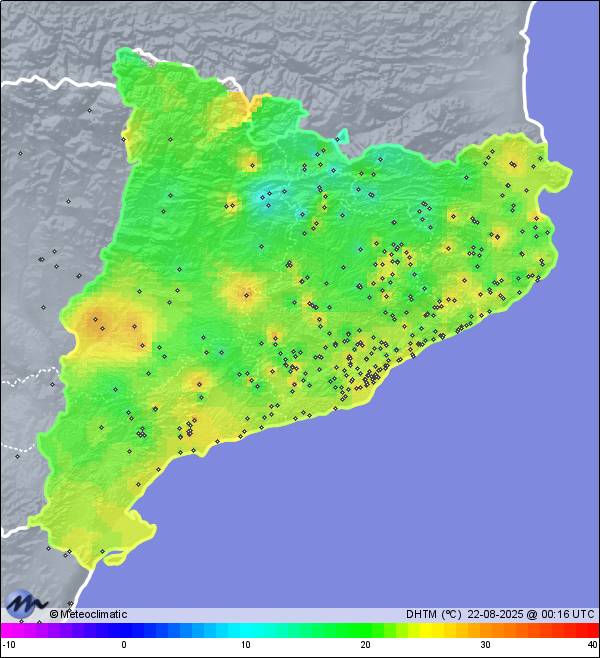 | 21-08-2025 | | | Máx. | Mín. | | | Temperatura | 30,1 | 17,6 | °C | | Humedad | 75 | 37 | % | | Viento | 37 | n/a | km/h | | Presión | 1.014 | 1.009 | hPa | | Precipitación | 0,0 | mm |
