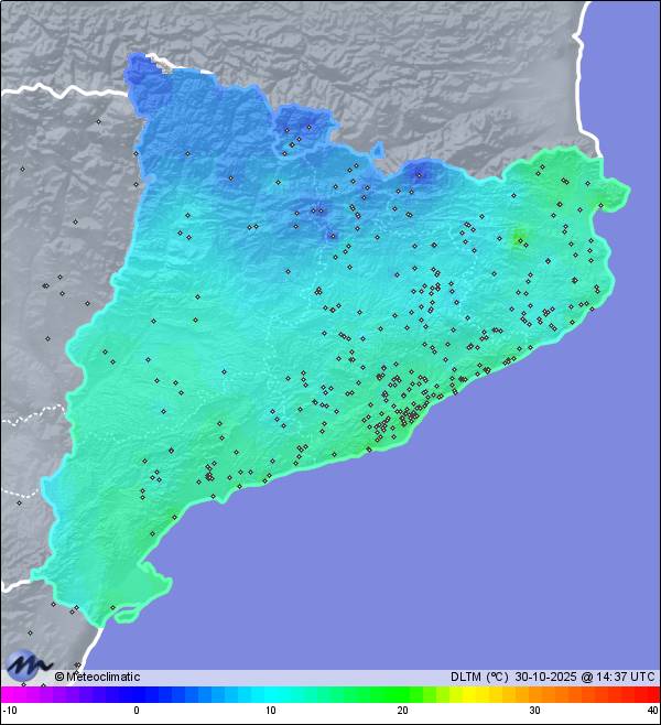 | Act. | Máx. | Mín.  | Act. | Máx. | Mín. | Act. | Máx. | Mín. | Act. | Máx. | Hoy | Año |  |  | Rubió | 1714 | 10,2 | 10,2 | 4,6 | 72 | 95 | 70 | 1.009 | 1.010 | 1.007 | - | 26 | - | 631,0 |  |  |  | Gósol | 1445 | 9,8 | 9,8 | 4,8 | 77 | 93 | 77 | 1.017 | 1.017 | 1.015 | - | 17 | 0,3 | 1.040,6 |  |  |  | Vilaller - Txambonet | 980 | 6,3 | 6,3 | 4,8 | 99 | 99 | 99 | x | x | x | - | 4 | 0,2 | 1.024,6 |  |  |  | La Torre de Cabdella | 1425 | 8,2 | 8,3 | 5,3 | 79 | 90 | 75 | 1.014 | 1.014 | 1.012 | 4 ENE | 15 | - | 1.294,5 |  |  |  | Port del Comte 6Q3R | 1788 | 6,9 | 7,4 | 5,4 | 78 | 91 | 69 | 1.013 | 1.013 | 1.010 | 2 W | 21 | - | 972,0 |  |  |  | Tuixent | 1125 | 8,4 | 9,2 | 5,4 | 92 | 92 | 91 | 1.013 | 1.013 | 1.011 | - | 0 | 0,2 | 884,6 |  |  |  | Sta Magdalena de Serinyà | 1230 | 6,6 | 9,4 | 6,5 | 97 | 97 | 95 | 1.011 | 1.011 | 1.009 | - | 7 | 0,3 | 754,7 |  |  |  | Fígols i Alinyà-Canelles | 600 | 9,7 | 9,8 | 6,7 | 98 | 98 | 98 | 1.013 | 1.013 | 1.011 | - | 2 | - | 824,6 |  |  |  | Coll de Nargó | 575 | 9,9 | 9,9 | 7,4 | 96 | 96 | 95 | 1.015 | 1.015 | 1.011 | x | x | 0,1 | 730,3 |  |  |  | Solsona | 670 | 11,3 | 12,8 | 7,4 | 99 | 99 | 97 | 1.012 | 1.012 | 1.009 | 3 WNW | 10 | - | 729,6 |  |  |  | Rialp | 725 | 8,8 | 9,9 | 7,6 | 92 | 99 | 90 | 1.002 | 1.002 | 1.002 | - | 12 | - | 838,0 |  |  |  | La Seu d'Urgell | 686 | 8,9 | 8,9 | 7,9 | 99 | 99 | 99 | 1.014 | 1.014 | 1.012 | - | 4 | x | x |  |  |  | Figuerola d'Orcau | 550 | 10,5 | 10,5 | 8,8 | 94 | 94 | 93 | 1.015 | 1.015 | 1.012 | - | 3 | - | 598,0 |  |  |  | Sant Martí de Canals | 650 | 9,4 | 9,9 | 9,0 | 97 | 100 | 96 | 1.015 | 1.015 | 1.011 | 2 ESE | 5 | 0,2 | 528,6 |  |  |  | Suterranya | 561 | 10,6 | 10,7 | 9,3 | 99 | 99 | 98 | 1.013 | 1.013 | 1.010 | - | 5 | - | 564,4 |  |  |  | Erinya | 743 | 11,5 | 11,5 | 10,2 | 92 | 96 | 92 | 1.015 | 1.015 | 1.011 | - | 3 | 0,2 | 610,0 |  |  |  | Artesa de Segre | 330 | 12,2 | 13,1 | 11,6 | 99 | 99 | 99 | 1.016 | 1.017 | 1.012 | - | 7 | 0,2 | 425,6 |  |  |  | Cervià de les Garrigues | 444 | 13,1 | 13,3 | 11,7 | 99 | 99 | 98 | 1.012 | 1.012 | 1.009 | 2 WNW | 15 | 0,2 | 397,4 |  |  |  | La Granadella | 528 | 11,8 | 13,7 | 11,7 | 94 | 94 | 93 | 1.015 | 1.015 | 1.010 | 3 W | 19 | - | 329,8 |  |  |  | Balaguer | 235 | 13,4 | 15,5 | 11,8 | 92 | 92 | 90 | 1.013 | 1.013 | 1.009 | - | 10 | 2,7 | 429,9 |  |  |  | Bell-lloc d'Urgell | 201 | 12,5 | 13,2 | 12,2 | 99 | 99 | 99 | 1.014 | 1.014 | 1.012 | 4 W | 12 | x | x |  |  |  | Pradell de Sió | 316 | 12,8 | 14,3 | 12,6 | 68 | 72 | 68 | 1.014 | 1.014 | 1.010 | - | 8 | 0,2 | 317,6 |  |  |  | Els Omellons | 410 | 14,0 | 14,4 | 12,9 | 95 | 98 | 95 | 1.018 | 1.018 | 1.013 | 5 W | 7 | - | 368,3 |  |  |  | Alpicat 2 | 255 | 13,6 | 13,7 | 13,2 | x | x | x | 1.012 | 1.012 | 1.009 | x | x | - | 336,6 |  |  |  | Juneda - Plaça Església | 277 | 13,5 | 13,9 | 13,4 | 98 | 99 | 98 | 1.015 | 1.015 | 1.011 | 9 WSW | 22 | x | x |  |  |  | Lleida - Ciutat Jardí | 207 | 13,8 | 13,8 | 13,5 | 99 | 99 | 99 | 1.015 | 1.015 | 1.012 | x | x | - | 306,1 |  |  |  | Arbeca | 332 | 13,7 | 15,0 | 13,6 | 99 | 99 | 99 | 1.017 | 1.017 | 1.012 | - | 9 | x | x |  |
