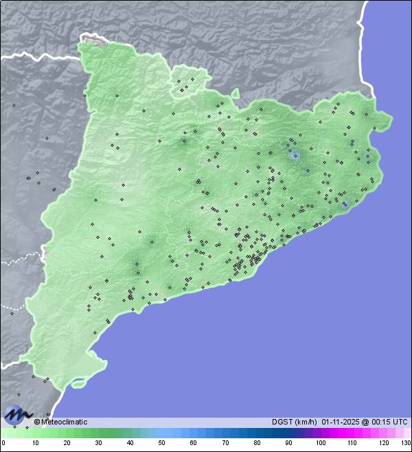 | Act. | Máx. | Mín. | Act. | Máx. | Mín. | Act. | Máx. | Mín. | Act. | Máx.  | Hoy | Año |  |  | El Masnou - Can Humet | 22 | 18,0 | 24,4 | 15,0 | 68 | 83 | 47 | x | x | x | 2 NW | 64 | - | 533,0 |  |  |  | Cadí Est- PN Cadí-Moixeró | 2440 | 7,8 | 7,8 | 7,5 | 69 | 69 | 68 | x | x | x | 63 SSE | 63 | - | - |  |  |  | Cabrera de Mar-SJoan Munt | 170 | 18,6 | 23,0 | 14,5 | 73 | 92 | 54 | 1.015 | 1.016 | 1.013 | 28 SE | 48 | - | 700,8 |  |  |  | Bellmunt | 1241 | 8,5 | 11,6 | 7,3 | 87 | 95 | 79 | 1.015 | 1.016 | 1.012 | 23 WSW | 40 | - | 718,2 |  |  |  | Bellmunt - Santuari | 1246 | 9,1 | 12,6 | 7,9 | 91 | 94 | 82 | 1.018 | 1.019 | 1.015 | 23 W | 39 | 0,2 | 697,8 |  |  |  | Gualba | 164 | 15,6 | 22,8 | 10,4 | 74 | 93 | 46 | 1.014 | 1.016 | 1.012 | 17 E | 39 | - | 807,4 |  |  |  | Malgrat de mar | 4 | 18,3 | 21,6 | 12,6 | 73 | 89 | 70 | 1.020 | 1.021 | 1.018 | 5 WSW | 39 | - | 263,6 |  |  |  | Puigllançada- Coll de Pal | 2092 | 9,2 | 9,2 | 9,1 | 34 | 34 | 29 | 1.014 | 1.014 | 1.014 | 39 SW | 39 | - | - |  |  |  | Sant Feliu de Llobregat | 48 | 14,5 | 14,8 | 14,5 | 85 | 86 | 85 | 1.019 | 1.019 | 1.019 | 15 SW | 39 | - | 405,9 |  |  |  | Veciana | 608 | 10,8 | 18,0 | 9,8 | 87 | 98 | 65 | 1.017 | 1.018 | 1.015 | 4 NNW | 39 | - | 484,0 |  |  |  | Collsuspina - Centre | 901 | 10,3 | 17,0 | 8,9 | 88 | 99 | 73 | 1.016 | 1.016 | 1.014 | 8 SW | 37 | 0,2 | 617,6 |  |  |  | Canet de Mar - Rial Oms | 50 | 18,1 | 22,4 | 13,1 | 72 | 93 | 68 | 1.016 | 1.017 | 1.014 | 5 WNW | 36 | - | 464,0 |  |  |  | Rubí - Andromeda | 150 | 13,1 | 22,4 | 10,6 | 87 | 97 | 50 | 1.015 | 1.015 | 1.012 | 8 SE | 36 | - | 595,7 |  |  |  | La Batllòria - Vallès Ori | 97 | 16,7 | 23,9 | 10,0 | 72 | 93 | 45 | 1.015 | 1.016 | 1.013 | 10 WSW | 35 | 0,2 | 805,4 |  |  |  | Palafolls Mas La Pomareda | 12 | 17,8 | 22,5 | 10,4 | 75 | 99 | 66 | 1.017 | 1.017 | 1.015 | 10 S | 35 | x | x |  |  |  | Badalona - Centre | 30 | 17,6 | 23,3 | 15,1 | 76 | 83 | 49 | 1.016 | 1.017 | 1.014 | 11 NNW | 34 | - | 381,6 |  |  |  | Matadepera - Centre | 426 | 12,6 | 21,7 | 11,1 | 83 | 100 | 48 | 1.016 | 1.049 | 1.014 | - | 34 | - | 730,9 |  |  |  | Sentfores (La Guixa) | 512 | 7,1 | 19,8 | 6,6 | 96 | 99 | 64 | 1.015 | 1.015 | 1.012 | 2 W | 34 | - | 643,8 |  |  |  | Sant Quintí de Mediona | 330 | 12,0 | 21,3 | 10,8 | 89 | 94 | 54 | 1.010 | 1.011 | 1.008 | 9 NW | 33 | x | x |  |  |  | La Font del Bosc Mediona | 553 | 12,7 | 18,8 | 10,4 | 83 | 91 | 57 | 1.017 | 1.017 | 1.015 | 1 WNW | 32 | - | 1.023,4 |  |  |  | Sant Celoni - Diputació | 170 | 15,4 | 22,9 | 10,2 | 78 | 96 | 48 | 1.014 | 1.015 | 1.012 | 5 W | 32 | - | 799,4 |  |  |  | Sant Feliu deLlob.S.Josep | 26 | 12,9 | 22,9 | 11,9 | 85 | 88 | 44 | 1.016 | 1.016 | 1.013 | 8 NNW | 32 | - | 26,8 |  |  |  | Cardona - Turó Rossinyol | 560 | 9,3 | 19,2 | 7,4 | 94 | 99 | 56 | 1.017 | 1.018 | 1.015 | 2 WNW | 31 | - | 530,1 |  |  |  | Manresa | 251 | 11,2 | 21,4 | 8,9 | 86 | 95 | 50 | 1.016 | 1.016 | 1.012 | 1 NE | 31 | - | 653,6 |  |  |  | Mataró -Nord | 144 | 17,0 | 23,8 | 14,0 | 70 | 84 | 43 | 1.015 | 1.015 | 1.013 | 12 NNW | 31 | - | 577,4 |  |  |  | Parets del Vallès | 123 | 12,6 | 22,9 | 10,1 | 85 | 94 | 48 | x | x | x | 2 SSE | 31 | - | 643,1 |  |  |  | Pineda de Mar - Les Creus | 30 | 17,8 | 21,7 | 11,7 | 74 | 99 | 68 | 1.017 | 1.018 | 1.015 | 2 SW | 31 | - | 571,7 |  |  |  | Sant Pere de Riudebitlles | 260 | 11,3 | 21,4 | 8,8 | 95 | 99 | 58 | 1.015 | 1.016 | 1.013 | 4 WSW | 31 | - | 637,2 |  |  |  | Sta. Margarida de Montbui | 320 | 9,7 | 20,6 | 6,7 | 90 | 97 | 56 | 1.017 | 1.017 | 1.014 | - | 31 | - | 462,0 |  |  |  | Suria | 286 | 8,5 | 20,6 | 7,5 | 91 | 95 | 53 | 1.016 | 1.017 | 1.013 | 3 NE | 31 | - | 673,8 |  |  |  | Viladecavalls | 290 | 13,3 | 21,4 | 10,5 | 83 | 96 | 57 | 1.015 | 1.016 | 1.013 | - | 31 | - | 751,6 |  |  |  | El Bedorc - Piera | 220 | 12,0 | 23,0 | 9,4 | 81 | 91 | 50 | 1.019 | 1.020 | 1.017 | 1 E | 30 | - | 605,9 |  |  |  | Mataró-Can Canyellas | 144 | 17,0 | 23,2 | 14,0 | 76 | 87 | 52 | 1.014 | 1.014 | 1.011 | 21 NW | 30 | - | 573,5 |  |  |  | Piera | 310 | 11,1 | 21,4 | 9,1 | 85 | 95 | 49 | 1.017 | 1.017 | 1.014 | 2 W | 30 | - | 309,9 |  |  |  | Sabadell - Centre | 197 | 14,9 | 22,8 | 12,7 | 77 | 89 | 54 | 1.016 | 1.016 | 1.014 | 2 NNW | 29 | - | 567,2 |  |  |  | Súria (tractets) | 340 | 9,3 | 19,9 | 8,0 | 92 | 96 | 60 | 1.018 | 1.018 | 1.015 | - | 29 | 0,2 | 661,2 |  |  |  | Taradell (Dr.Fleming) | 625 | 13,7 | 19,1 | 8,4 | 75 | 96 | 62 | 1.015 | 1.016 | 1.013 | 3 S | 29 | 0,2 | 548,8 |  |  |  | Aiguafreda Aj. | 427 | 9,4 | 22,3 | 7,9 | 94 | 98 | 49 | 1.016 | 1.016 | 1.013 | - | 28 | 0,1 | 727,3 |  |  |  | Badalona-St.Antoni Llefià | 35 | 16,7 | 24,0 | 13,6 | 74 | 85 | 45 | 1.015 | 1.015 | 1.012 | 2 NNE | 28 | - | 474,3 |  |  |  | Barcelona-TorGuineu Navas | 40 | 17,2 | 23,8 | 14,1 | 73 | 87 | 46 | 1.018 | 1.019 | 1.016 | - | 28 | x | x |  |  |  | Sant Esteve Sesrovires N | 215 | 13,0 | 21,9 | 10,7 | 88 | 95 | 58 | 1.020 | 1.021 | 1.018 | - | 28 | - | 28,9 |  |  |  | Canet de Mar | 40 | 19,2 | 22,3 | 14,7 | 69 | 86 | 65 | 1.015 | 1.016 | 1.014 | 13 WSW | 27 | - | 470,0 |  |  |  | Canet de Mar - Centre | 42 | 19,2 | 19,2 | 19,0 | 70 | 71 | 70 | 1.014 | 1.014 | 1.013 | 16 W | 27 | - | 462,0 |  |  |  | el masnou-ctra-alella | 27 | 18,1 | 23,4 | 14,1 | 71 | 88 | 47 | 1.016 | 1.017 | 1.014 | 5 WSW | 27 | - | 517,3 |  |  |  | Torrelavit | 266 | 12,4 | 21,6 | 9,1 | 87 | 97 | 53 | 1.016 | 1.017 | 1.014 | 1 NE | 27 | - | 755,2 |  |  |  | Barcelona - Hosp. Dexeus | 90 | 18,2 | 24,0 | 16,1 | 69 | 84 | 46 | 1.015 | 1.016 | 1.013 | - | 26 | - | 412,8 |  |  |  | Calldetenes | 488 | 8,1 | 19,5 | 7,0 | 97 | 100 | 54 | 1.017 | 1.017 | 1.014 | 3 ESE | 26 | - | 726,7 |  |  |  | Cardona_Salinera | 393 | 8,8 | 19,5 | 6,7 | 92 | 96 | 52 | 1.017 | 1.017 | 1.014 | - | 26 | - | 279,1 |  |  |  | Cussons - Sora | 636 | 6,5 | 16,8 | 6,3 | 96 | 97 | 79 | 1.015 | 1.016 | 1.013 | 6 W | 26 | - | 620,2 |  |  |  | La Garriga (Ajuntament) | 247 | 13,3 |