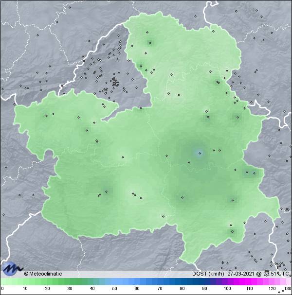 | 27-03-2021 | | | Máx. | Mín. | | | Temperatura | 15,6 | 6,3 | °C | | Humedad | 93 | 57 | % | | Viento | 39 | n/a | km/h | | Presión | 1.028 | 1.024 | hPa | | Precipitación | 0,0 | mm |