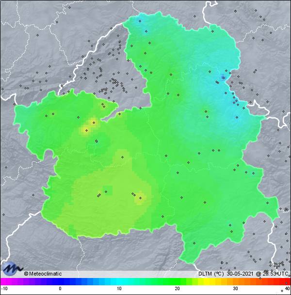 | 30-05-2021 | | | Máx. | Mín. | | | Temperatura | 20,6 | 8,7 | °C | | Humedad | 98 | 60 | % | | Viento | 30 | n/a | km/h | | Presión | 1.020 | 1.016 | hPa | | Precipitación | 13,0 | mm |