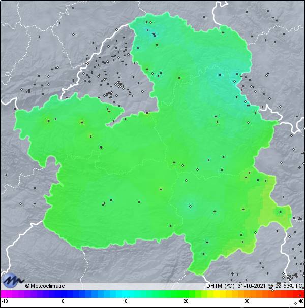 | 31-10-2021 | | | Máx. | Mín. | | | Temperatura | 15,1 | 10,8 | °C | | Humedad | 92 | 84 | % | | Viento | 35 | n/a | km/h | | Presión | 1.011 | 1.009 | hPa | | Precipitación | 13,4 | mm |