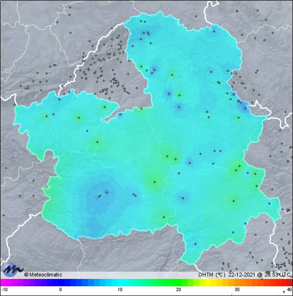 | 22-12-2021 | | | Máx. | Mín. | | | Temperatura | 13,2 | 3,7 | °C | | Humedad | 98 | 74 | % | | Viento | 16 | n/a | km/h | | Presión | 1.023 | 1.020 | hPa | | Precipitación | 0,0 | mm |