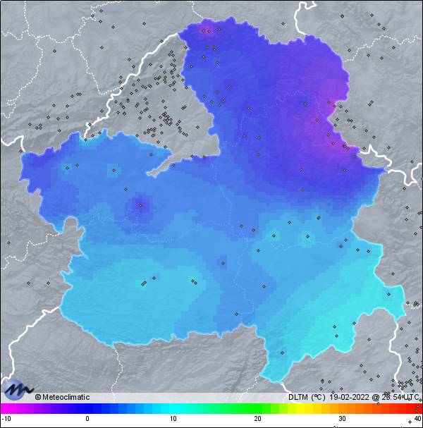 | 19-02-2022 | | | Máx. | Mín. | | | Temperatura | 6,3 | -1,0 | °C | | Humedad | 94 | 73 | % | | Viento | 43 | n/a | km/h | | Presión | 1.028 | 1.018 | hPa | | Precipitación | 4,6 | mm |