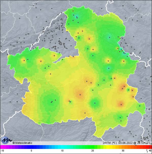 | 03-06-2022 | | | Máx. | Mín. | | | Temperatura | 22,0 | 6,9 | °C | | Humedad | 85 | 28 | % | | Viento | 37 | n/a | km/h | | Presión | 1.022 | 1.011 | hPa | | Precipitación | 0,0 | mm |