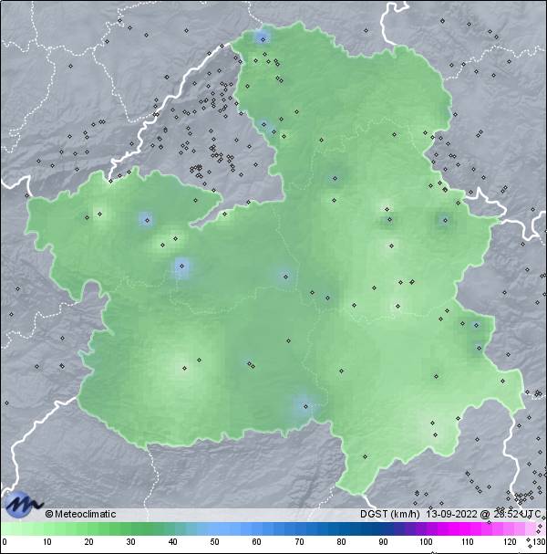| 13-09-2022 | | | Máx. | Mín. | | | Temperatura | 20,5 | 12,9 | °C | | Humedad | 96 | 54 | % | | Viento | 45 | n/a | km/h | | Presión | 1.017 | 1.013 | hPa | | Precipitación | 13,6 | mm |
