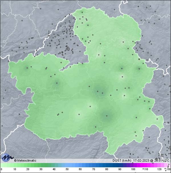 | 17-02-2023 | | | Máx. | Mín. | | | Temperatura | 14,8 | -3,1 | °C | | Humedad | 92 | 22 | % | | Viento | 31 | n/a | km/h | | Presión | 1.037 | 1.029 | hPa | | Precipitación | 0,0 | mm |