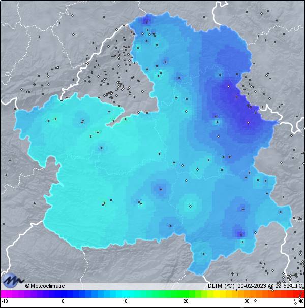 | 20-02-2023 | | | Máx. | Mín. | | | Temperatura | 17,4 | -0,8 | °C | | Humedad | 92 | 32 | % | | Viento | 6 | n/a | km/h | | Presión | 1.028 | 1.023 | hPa | | Precipitación | 0,0 | mm |