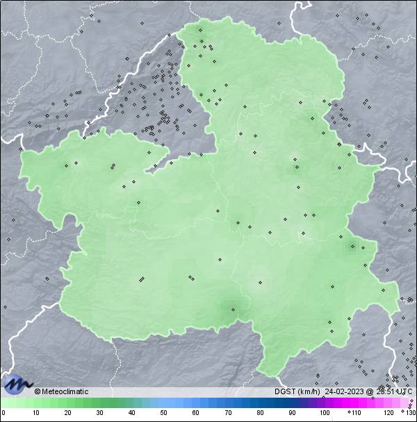 | 24-02-2023 | | | Máx. | Mín. | | | Temperatura | 6,4 | -3,9 | °C | | Humedad | 89 | 54 | % | | Viento | 32 | n/a | km/h | | Presión | 1.015 | 1.011 | hPa | | Precipitación | 0,0 | mm |