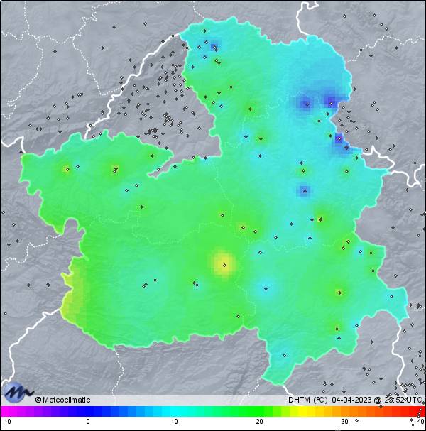 | 04-04-2023 | | | Máx. | Mín. | | | Temperatura | 14,0 | -7,8 | °C | | Humedad | 94 | 21 | % | | Viento | 32 | n/a | km/h | | Presión | 1.027 | 1.010 | hPa | | Precipitación | 0,0 | mm |