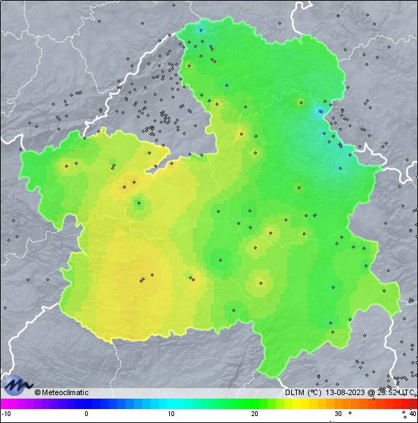 | 13-08-2023 | | | Máx. | Mín. | | | Temperatura | 36,0 | 19,4 | °C | | Humedad | 87 | 22 | % | | Viento | 41 | n/a | km/h | | Presión | 1.014 | 1.010 | hPa | | Precipitación | 0,0 | mm |