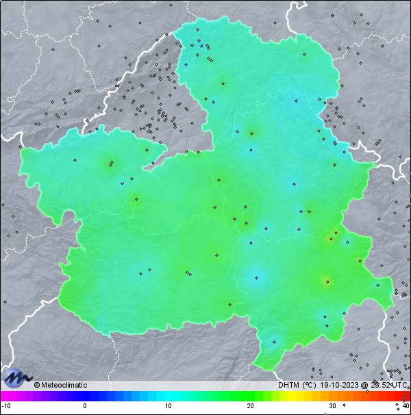 | 19-10-2023 | | | Máx. | Mín. | | | Temperatura | 21,8 | 10,3 | °C | | Humedad | 96 | 50 | % | | Viento | 37 | n/a | km/h | | Presión | 1.010 | 994 | hPa | | Precipitación | 8,9 | mm |